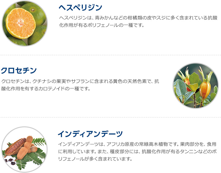 還元麦芽糖水飴、澱粉、インディアンデーツエキス、クチナシ抽出物(クロセチン含有)/結晶セルロース、ヘスペリジン、ビタミンC、ステアリン酸カルシウム